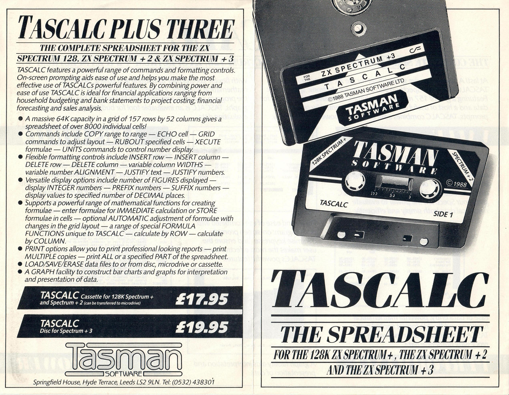 While the ZX Spectrum word processor Tasword II (and later versions from Tasman Software) are very well known products the surprisingly comprehensive spread sheet software from the same software house is almost unknown: Tascalc. The software itself is available from the usual places (ZXDB and World of Spectrum), but additional material is scarce.